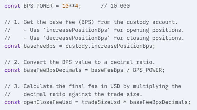 The price impact fee BPS is then multiplied by the trade size to find the fee in USD: