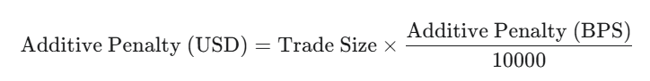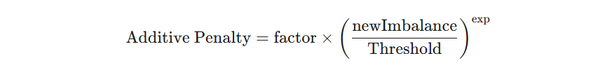 The additive fee is calculated as a penalty that scales based on the ratio of the open interest imbalance to the predefined threshold. If the imbalance is below the threshold, the additive penalty is zero.