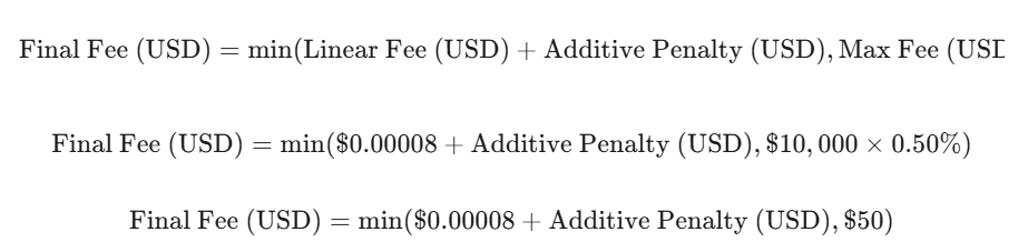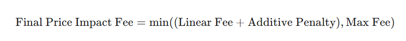 This penalty is then added to the linear price impact fee, and the total is capped by a Max Fee.