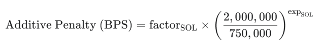 The imbalance of $2,000,000 is greater than the $750,000 threshold, so the penalty is applied. First, calculate the additive price impact fee in BPS: