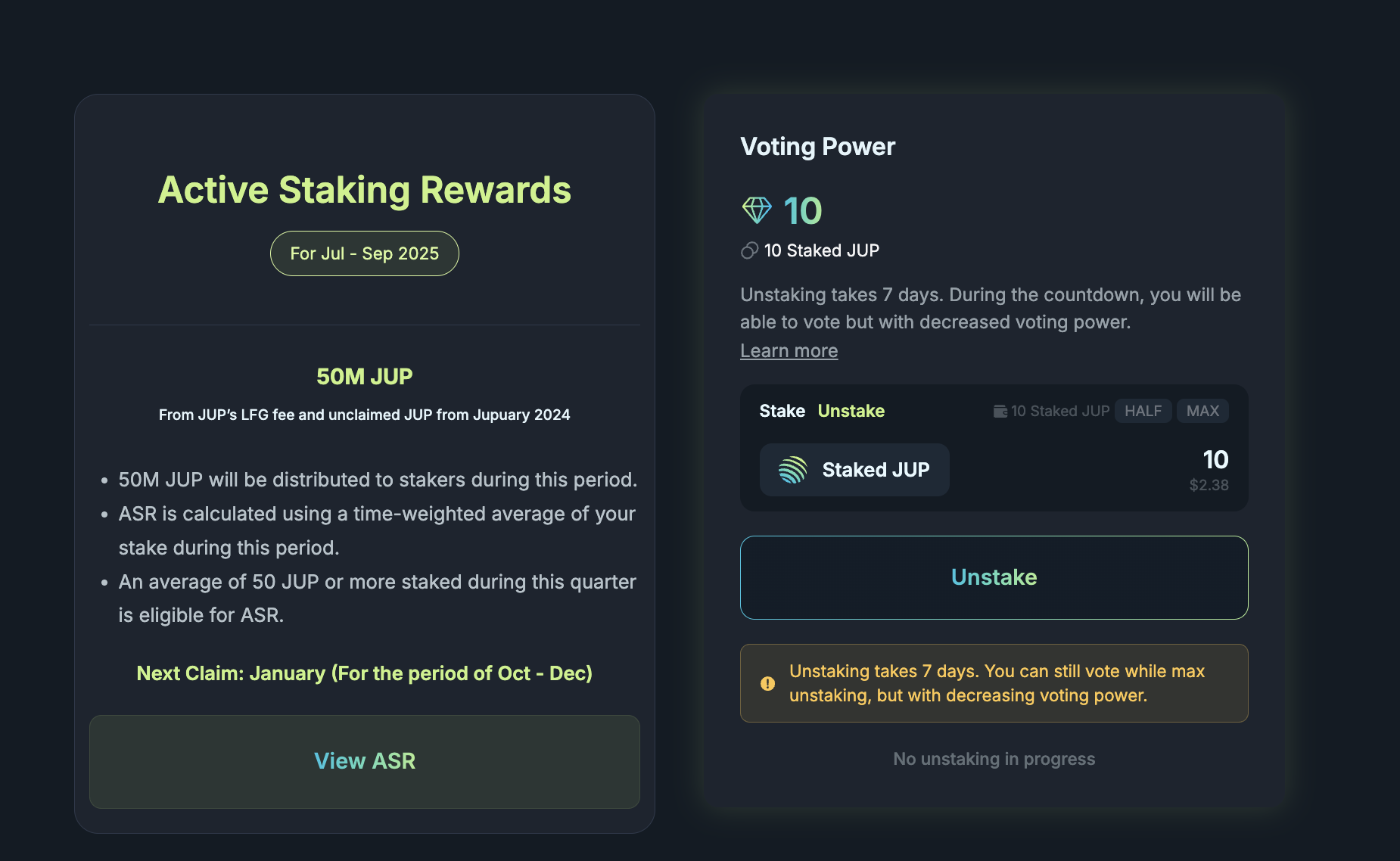 To Unstake your $JUP tokens, connect your wallet to the governance platform, and select the Unstake tab, located below your Voting Power. You can choose to unstake the full locked amount, or just a part of it, and start the 7 days unstaking process by selecting the Unstake button.