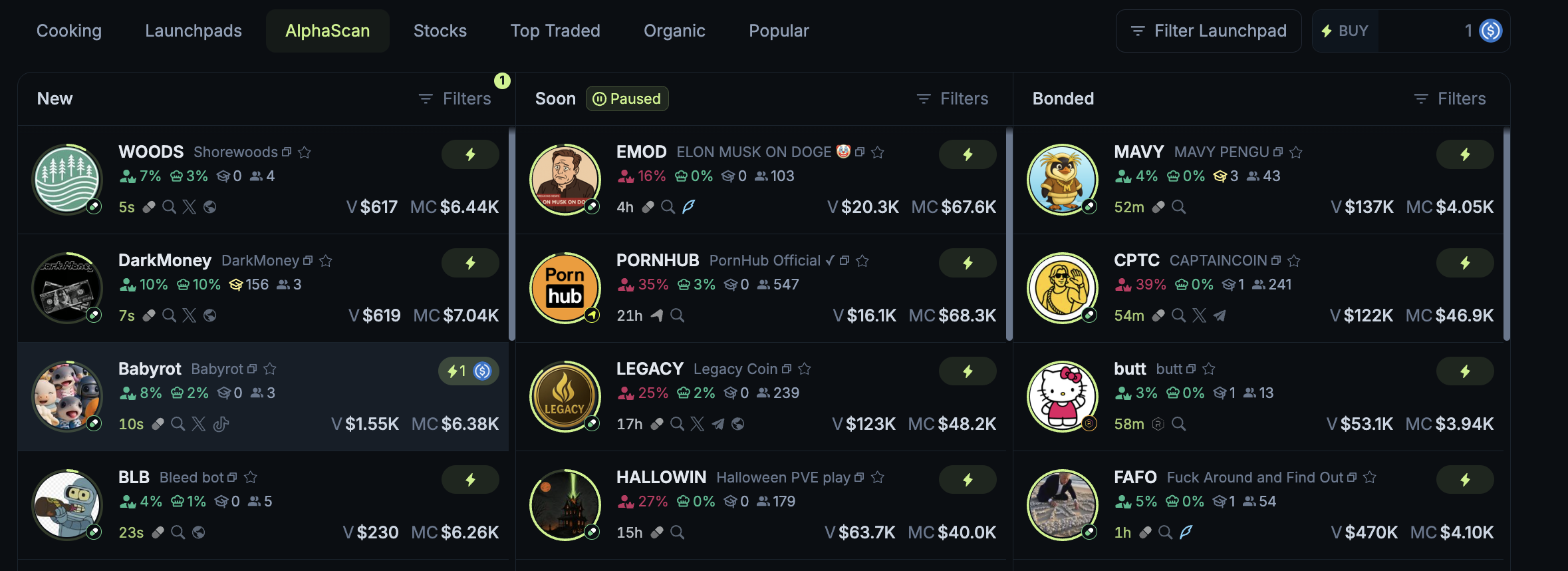 You can find a real-time feed of new token launches under the AlphaScan tab in Jupiter Terminal. You can also customize filters around trading metrics like volume and liquidity to tailor the feed to your preferences.