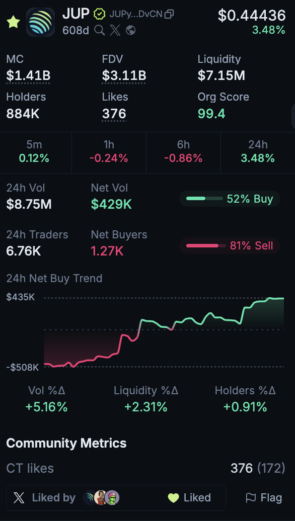 - CT Likes: Total verified X users that have liked the token on Jupiter