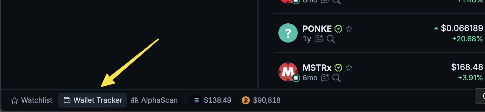 - At the bottom of the page, select Wallet Tracker. A panel will open on the left, allowing you to enter a wallet address or import a list of wallets to follow.